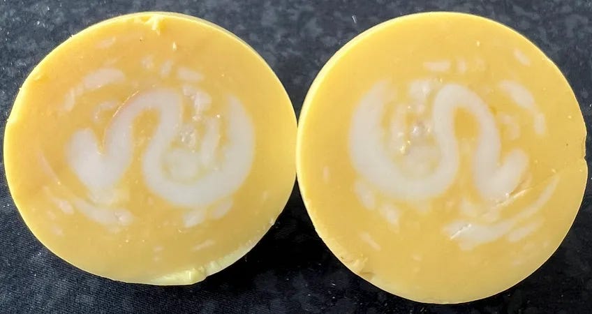 It can be hard to gauge how long to spin to get an intact and well-centered white, but I actually enjoy the over-spun patterns as much if not more. They give a sense of the forces and flows involved, and can be suggestively serpentine.