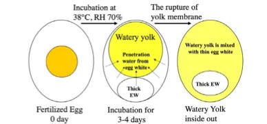 The authors guessed that 18th-century eggs were likely fertile, and found that this was in fact a key to the recipe’s success. Once fertilized, the germ cell riding on the yolk surface begins to develop into the embryonic chick. The membrane enclosing the yolk weakens, and moisture and proteins migrate from the white across the membrane into the yolk. Here is the diagram from Hatta et al: